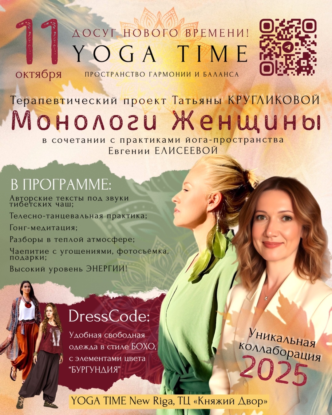 Уникальное мероприятие этой осени🍁 в пространстве YOGA TIME NEW RIGA - терапевтические МОНОЛОГИ ЖЕНЩИНЫ Татьяны Кругликовой в сочетании с глубокими практиками!🌟